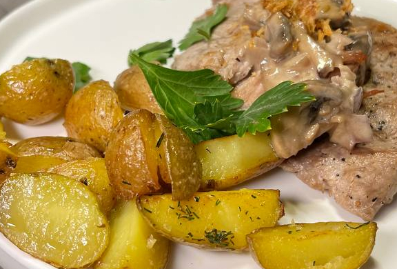 С бейби-картофелем в сливочно-грибном соусе